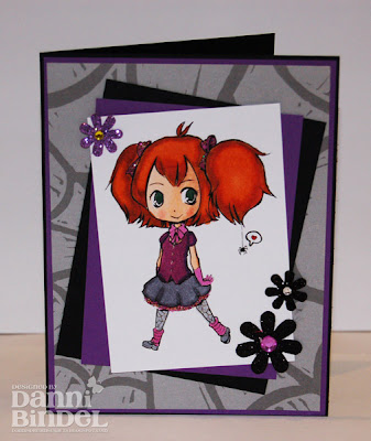 My first card is using Winona. I {love} the little spider hanging down from her ponytail! (if it were in real life I'd scream!) I'm sure Goth doesn't have sparkles either but well, it just needed sparkles!